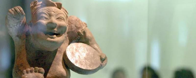 立式说唱俑拿的不是琴,是圆形扁鼓。击鼓说唱俑出土于四川成都天回山东汉崖墓,俑通高55厘米,以泥质灰陶制成,俑身上原有彩绘,已脱落。陶俑蹲坐在地面上,右腿扬起,左臂下挟有一圆形扁鼓,右手执鼓槌作敲击状。俑人嘴部张开,开怀大笑,仿佛正进行到说唱表演中的精彩之处。人物面部的幽默表情被刻画得极为生动传神,使观者产生极大的共鸣。击鼓说唱俑以写实主义的手法刻画出一位正在进行说唱表演的艺人形象,反映出东汉时期塑造艺术的高度成就,具有很高的艺术价值。