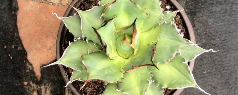 仁王冠小岛白刺的拉丁学名是Agave titanota Gentry。仁王冠又称严流,肉质叶排列成莲座状,叶片上半部呈狭椭圆形,顶端较尖,生有尖锐的黑褐色粗刺,叶缘上半部具有深褐色角质层。仁王冠强光下的植株叶片肥厚短小,弱光则叶片容易拉长。