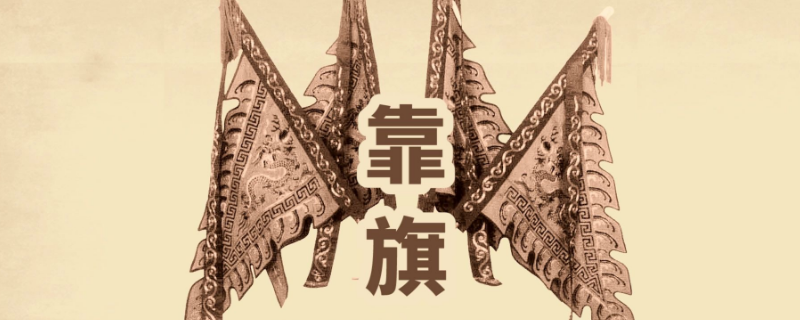 背面插着四面旗子的一般是武将。四面旗子,叫靠旗,是武生的行头。靠,中国戏曲服装专用名称,即甲衣。靠旗是插在背后的三角形的四面旗子,又叫护背旗。旗上有用各种彩线绣的龙纹,每面旗上附有一条彩色飘带。
