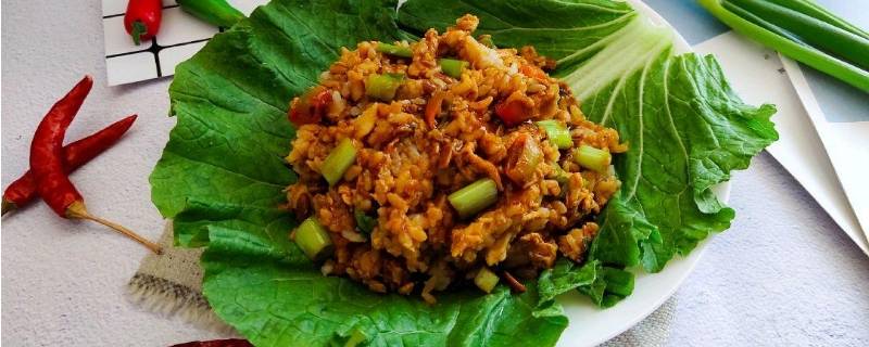 主料有大米、小米、大白菜叶(或干豆腐)、香菜、小葱、大酱、鸡蛋、土豆、香辣酥,取一张白菜叶放上二米饭、土豆泥、鸡蛋酱拌匀,在上面放上用手撕碎的小葱、香菜和炸好的土豆丝和香辣酥,包成四方包袱状,两手拿着吃。
