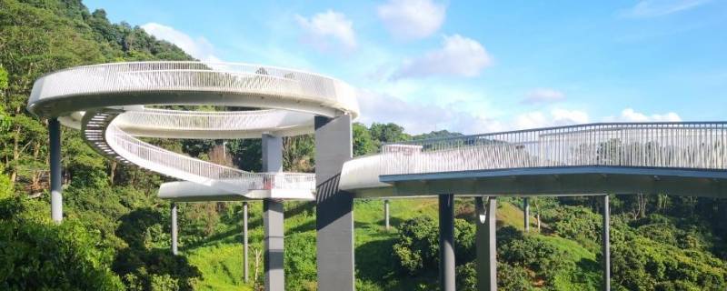 3、悬桥则突出灵动,形成人和风的互动,悬桥的结构形式是我国景观桥类的独家首创,桥体采用了国内首创的大跨钢板带索结构,桥长90米,主跨63.8米,主钢结构厚度只有40毫米。悬桥将绿道与对面荔枝山相连,并与运动森林公园的园路相互衔接、实现共通。