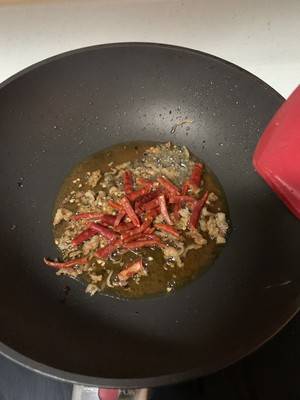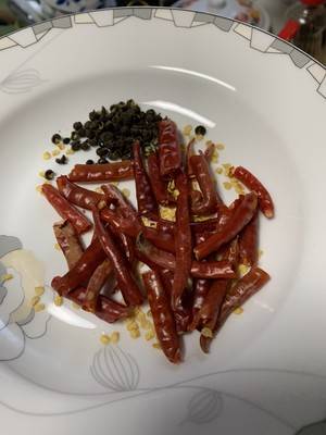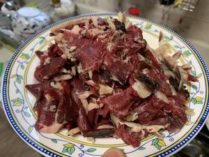 用料:牛干巴适量、蒜苗叶2根、干辣椒适量、花椒粒适量、姜片适量、料酒、鸡精。