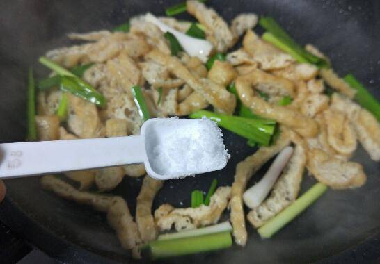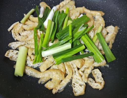 2、热锅下油爆炒豆皮蒜苗。