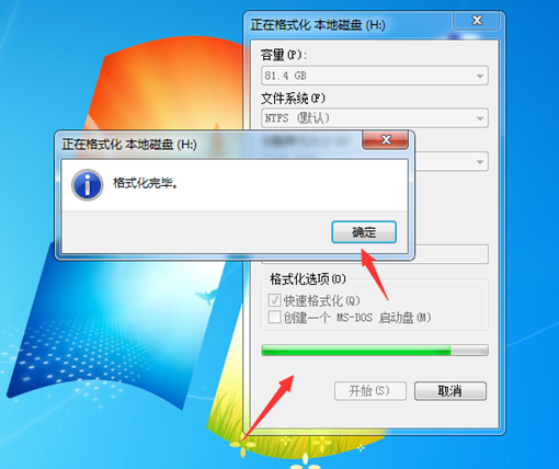 3、接着在弹出的窗口中,设置好格式,然后勾选“快速格式化”,再点击“开始”。