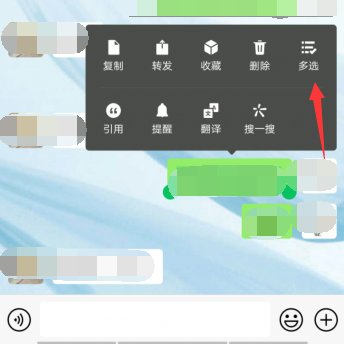 1、打开手机微信APP,手指长按任意一条聊天记录会弹出一个选项条,点击选择“多选”选项。