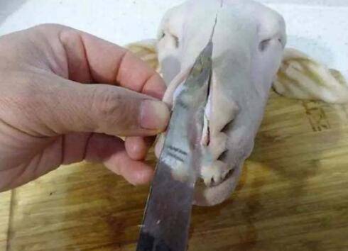 4、沥净水,用刀从头皮正中至鼻骨划一长口,以便于煮熟后拆骨。