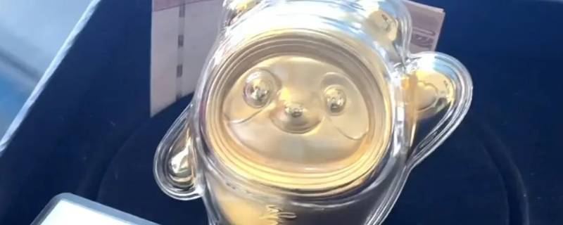 黄金冰墩墩全身都是黄色,使用纯金打造,外观是一只熊猫。因冬奥吉祥物冰墩墩是将熊猫形象与富有超能量的冰晶外壳相结合,其头部外壳造型取自冰雪运动头盔,并使用彩色光环装饰,整体形象酷似航天员。