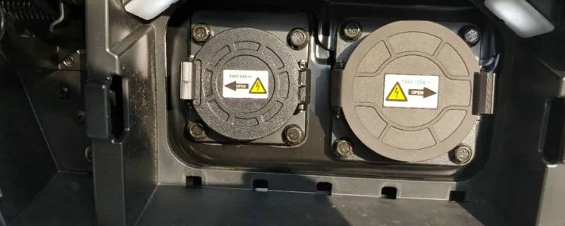 比亚迪e5充电口位于车前方中网车标后方,充电口舱门开关位于驾驶员侧仪表台左下方,拉起充电口盖开启手柄,充电口盖自动弹开。如果充电口舱门因天气等原因冻住,使用热水或不高于100℃的加热装置,将冰融化后再开启充电口舱门,请勿强行打开。