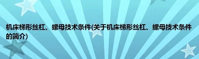 大家好,机床梯形丝杠、螺母技术条件,关于机床梯形丝杠、螺母技术条件的简介很多人还不知道,现在让我们一起来看看吧!