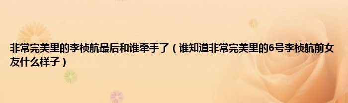 大家好,小常来为大家解答以上问题。非常完美里的李桢航最后和谁牵手了,谁知道非常完美里的6号李桢航前女友什么样子很多人还不知道,现在让我们一起来看看吧!