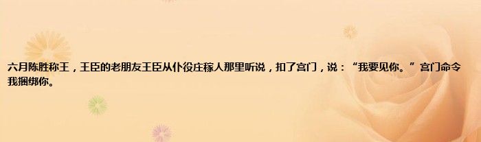 大家好,小常来为大家解答以上问题。六月陈胜称王,王臣的老朋友王臣从仆役庄稼人那里听说,扣了宫门,说:“我要见你。”宫门命令我捆绑你。很多人还不知道,现在让我们一起来看看吧!