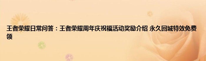 以上就是王者荣耀日常问答:王者荣耀周年庆祝福活动奖励介绍,永久回城特效免费领的推荐,相信通过王者荣耀日常问答:王者荣耀周年庆祝福活动奖励介绍,永久回城特效免费领这篇文章能帮到你,也欢迎对游戏很感兴趣小伙伴们一起来探讨。