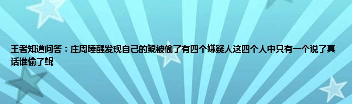 以上就是王者知道问答:庄周睡醒发现自己的鲲被偷了有四个嫌疑人这四个人中只有一个说了真话谁偷了鲲的推荐,相信通过王者知道问答:庄周睡醒发现自己的鲲被偷了有四个嫌疑人这四个人中只有一个说了真话谁偷了鲲这篇文章能帮到你,也欢迎对游戏很感兴趣小伙伴们一起来探讨。
