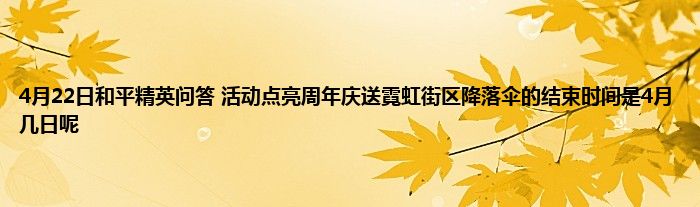 小编今天给各位玩家朋友们带来的是4月22日和平精英问答 活动点亮周年庆送霓虹街区降落伞的结束时间是4月几日呢,有记得的玩家朋友吗?不记得也没有关系,小编已经帮助大家把4月22日和平精英问答 活动点亮周年庆送霓虹街区降落伞的结束时间是4月几日呢找了出来,你只需要动动你的小手就可以轻松知道啦,快来瞧一瞧吧。