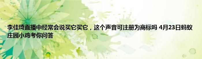 李佳琦直播中经常会说买它买它,这个声音可注册为商标吗 4月23日蚂蚁庄园小鸡考你问答,欢迎大家来到这里,能进来的小伙伴都有玩蚂蚁庄园的,支付宝蚂蚁庄园每天都会在小课堂更新一道题目,答对即可领取小鸡饲料180G,4月23日蚂蚁庄园问题是:李佳琦直播中经常会说买它买它,这个声音可注册为商标吗很多小伙伴都不知道李佳琦直播中经常会说买它买它,这个声音可注册为商标吗这个问题的答案是什么,那么小编就为大家分享下4月23日蚂蚁庄园课题问题的答案,希望对大家有所帮助!