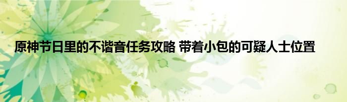 最近玩原神的玩家都在问,游戏里面的节日里的不谐音任务怎么做?这是一个寻人任务,我们需要寻找带着小包的可疑人士,他是盗宝团的卧底,很多玩家不知道他的位置,小编我特意整理了相关的资讯,下面就是这个可疑人士位置介绍了,一起来看看吧!