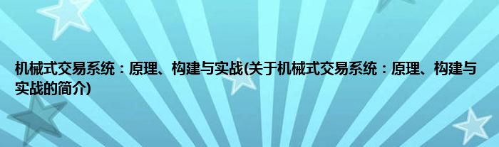 大家好,机械式交易系统:原理、构建与实战,关于机械式交易系统:原理、构建与实战的简介很多人还不知道,现在让我们一起来看看吧!
