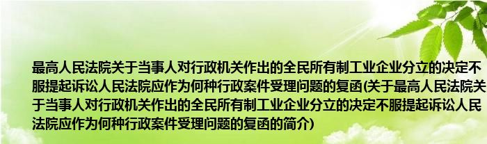 本文关于最高人民法院关于当事人对行政机关作出的全民所有制工业企业分立的决定不服提起诉讼人民法院应作为何种行政案件受理问题的复函的简介就讲解完毕,希望对大家有所帮助。