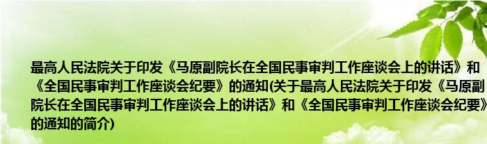 本文关于最高人民法院关于印发《马原副院长在全国民事审判工作座谈会上的讲话》和《全国民事审判工作座谈会纪要》的通知的简介就讲解完毕,希望对大家有所帮助。