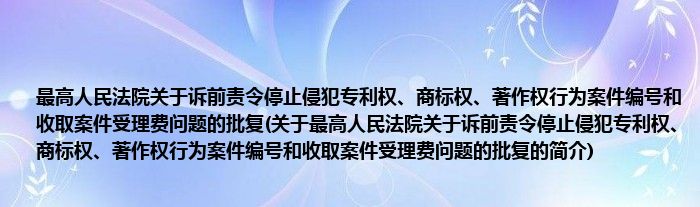1、 《最高人民法院关于诉前责令停止侵犯专利权、商标权、著作权行为案件编号和收取案件受理费问题的批复》是就上海市高级人民法《关于诉前责令停止侵权案件如何编制案号和收取受理费的请示》下发的批复。