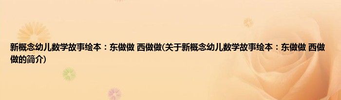 大家好,新概念幼儿数学故事绘本:东做做,西做做,关于新概念幼儿数学故事绘本:东做做,西做做的简介很多人还不知道,现在让我们一起来看看吧!