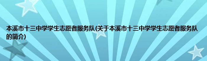 1、 本溪市十三中学学生志愿者服务队是由本溪市志愿服务联合会领导下的志愿团体。